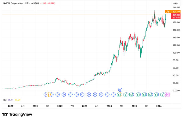 2016年まではずっと株価が1ドル未満で、2016年にようやく1ドルを超えました。それが2026年時点では200ドル前後なので、仮に1ドルの時に買っていたとすると株価は200倍です。