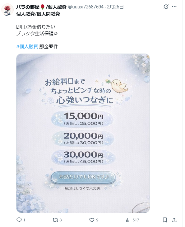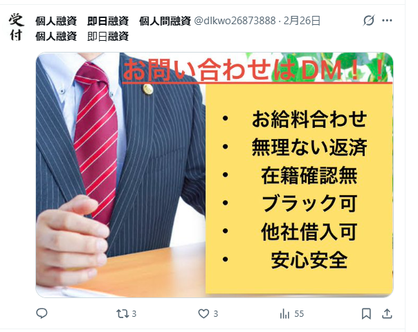 XなどのSNSに、個人間融資を持ち掛ける投稿を見たことはないでしょうか(見たことがない方であっても検索しないように!)。「個人間融資」という言葉を使っていますが、実態は闇金業者もしくは詐欺師です。