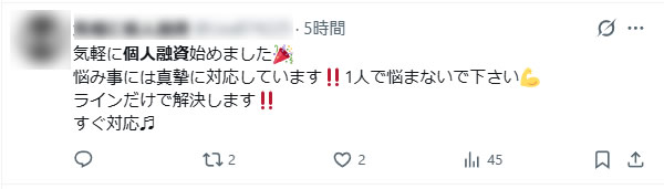 個人融資、個人間融資と銘打っていますが、そもそも個人間であっても金利を取ってお金を貸すことを商売にするのはは違法行為です。他にもさまざまな隠語や異なる表現を使ったりしていますが、その実態は闇金であることがほとんどなので、お金に困っているからといって利用しないようにしましょう。
