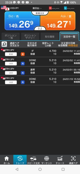 ちなみに、この画面にあるように今後全ポジションに対して5.21円の決済注文を入れるようにしています。もう5円を超えることはないかもしれませんが、もし超えて突飛高があるとしたらこのレベルなので、「ワンチャン狙い」です。