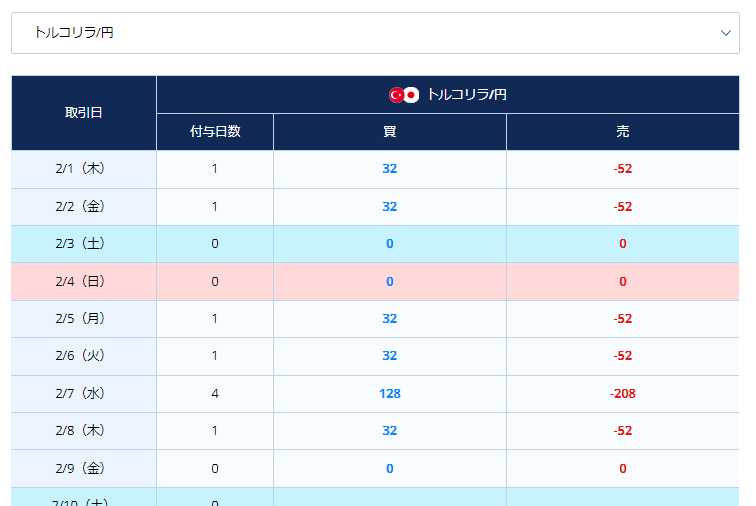 2024年2月時点で、トルコリラ円の買いポジションに対して1万通貨あたり30円少々のスワップポイントがつきます。それでは、トルコリラ円を取り扱っている3つ程度のFX会社について2月のスワップポイントを見てみましょう。