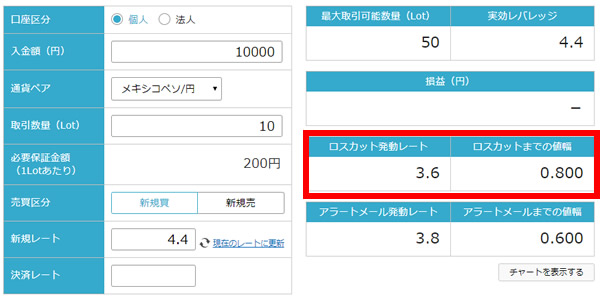 ここで見るべきは、赤い囲みの部分です。下にあるアラートメールというのは「まもなく証拠金が枯渇しますよ」という警告のメールが出されるレートです。メキシコペソ円が3.8円になったら警告が出て、そのまま放置してさらにレートが下がって3.6円になったら強制ロスカットになるということです。2020年4月現在、メキシコペソ円は4.2円台が史上最安値であり、これが割り込むことはまだありません。何度も4.2円台になったものの反発しているので、ここに強いサポートラインがあると考えて良いでしょう。