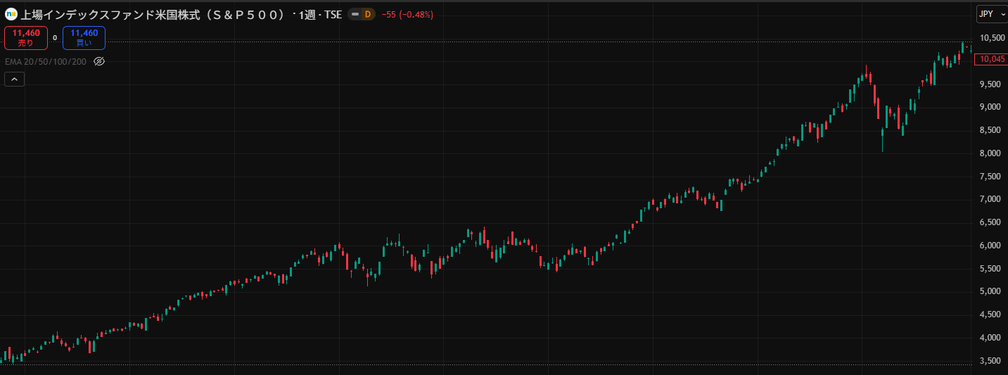 TOPIXは1年間チャートで上昇基調が見て取れますが、S&P500については10年近くも右肩上がりを続けています。