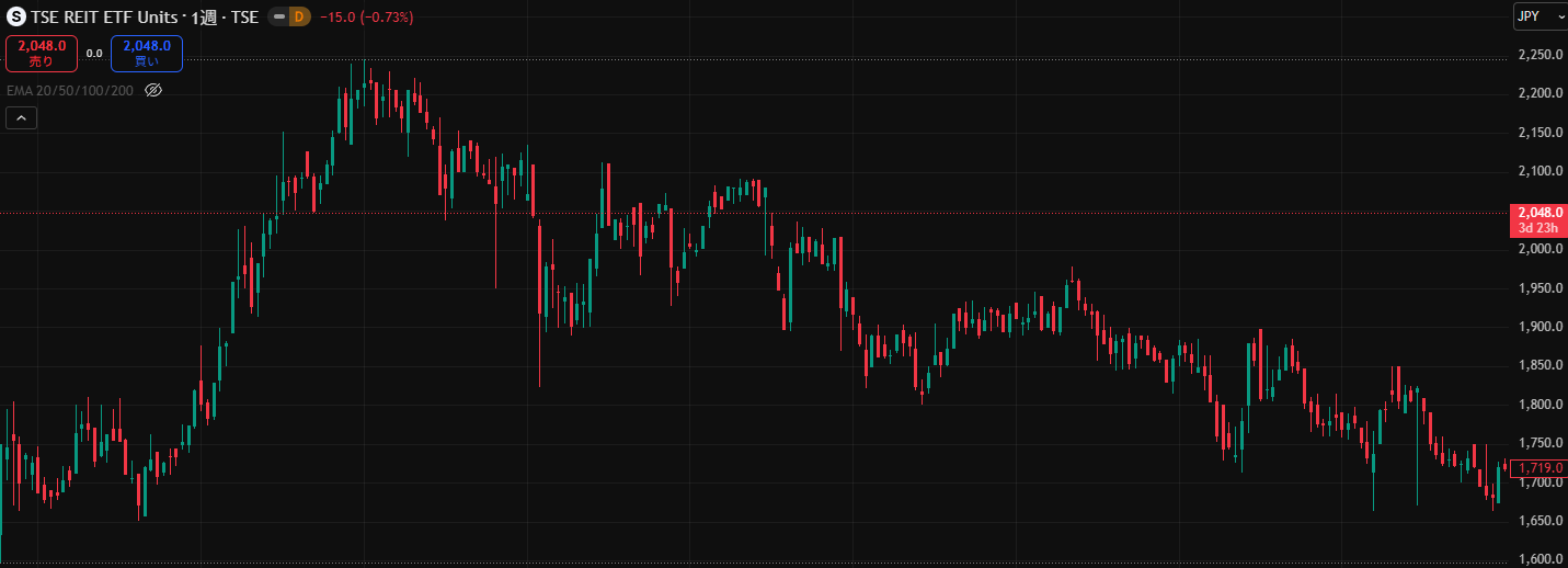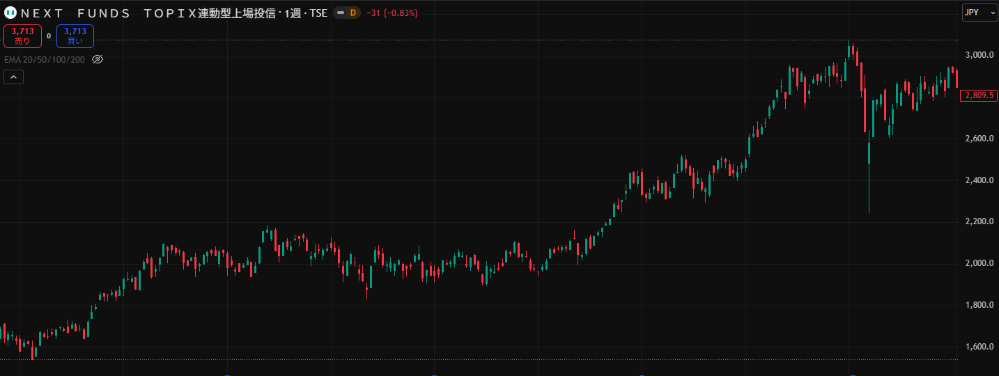 TOPIX連動型のETF「TOPIX連動型上場投資信託(1306)」の週足チャートは、こちら。
