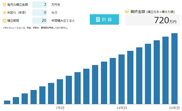 下の図を見てみてください。毎月光熱費を3万円浮かせて、それを20年間貯め続けるとそれだけで20年後には720万円になります。