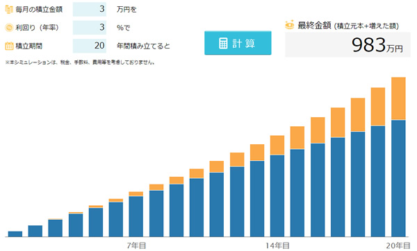 今度は、20年後に983万円という結果になりました。ほぼ1千万円なので、ここに上乗せでお金を貯めていくことができれば、1千万円を楽々クリアできることでしょう。