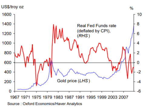 なぜならば、以下のグラフが示すように高金利の状況では利息が発生する債券などが好まれますが、低金利で実質利子率が下がるとゴールドの価格が上昇しやすい傾向があるからです。