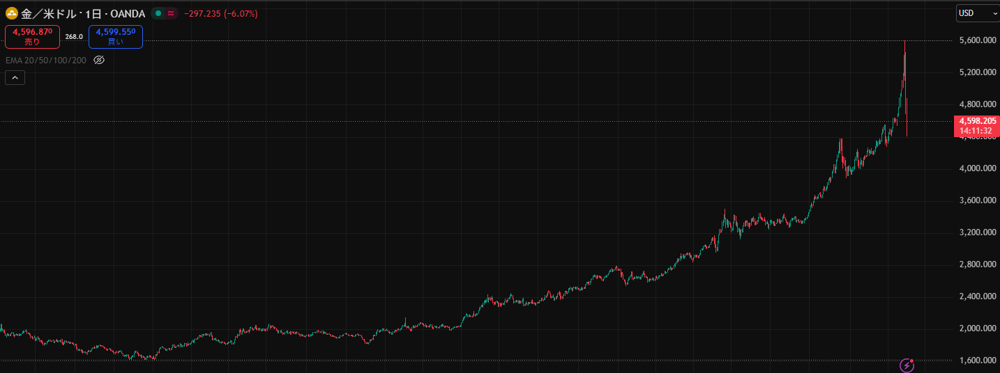 こちらは、金価格のチャートです。2022年10月頃から本格的な上昇を始め、そのトレンドが2026年になっても続きました。1月末には強烈な暴落があって本記事の執筆時点でも下げ止まっていませんが、それまでの上昇がいかに強かったかがチャートから見て取れます。