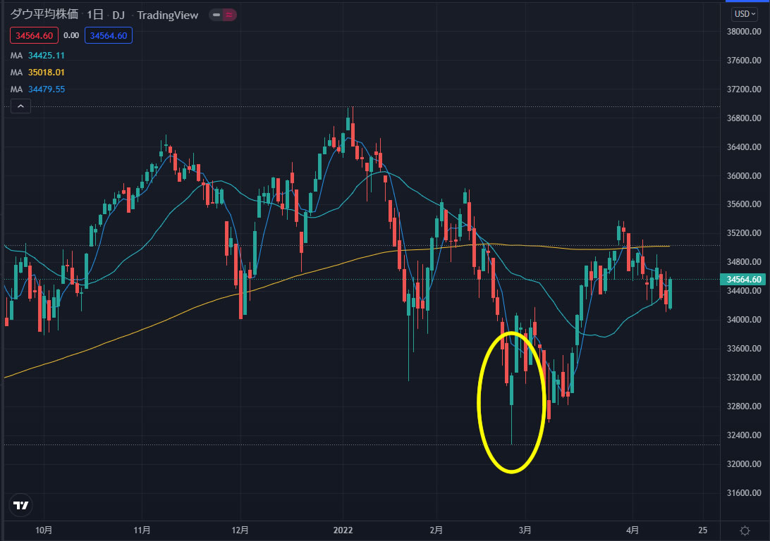 こちらは、2月24日のロシアによるウクライナ侵攻が起きた直後のNYダウです。