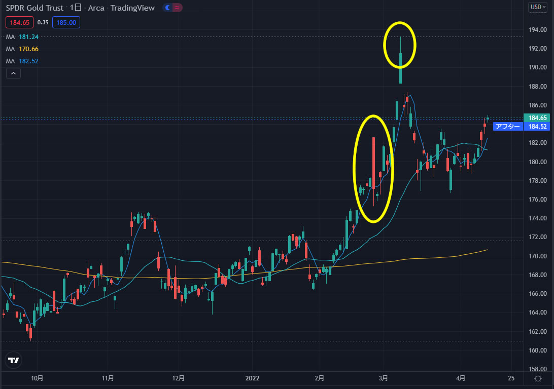 1つめの丸印が、2月24日の金価格です。その後さらにウクライナ情勢の緊迫化によってリスクオフ相場が加速し、さらに高値をつけています。利益確定の売りに押されて反落する場面もありますが、ウクライナ情勢が予断を許さないこともあって再び買い戻されているのがわかります。