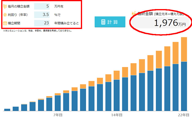 23年後には1,976万円というシミュレーション結果になりました。利回りは3.5%で計算していますが、これはカチケン編集部が考えるリスク許容度の範囲で計算したもので、もっと利回りの高い運用をすることができれば、この金額はさらに大きくなります。