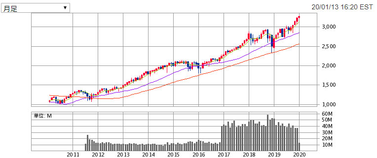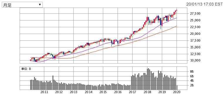 こちらは、ニューヨークダウ平均株価の10年チャートです。